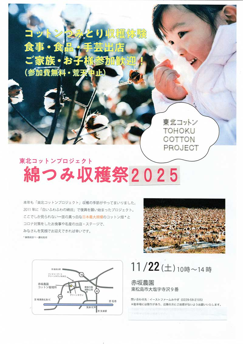 <日 時> 2025年11月22日(土)10:00~14:30 ※ポスターはこちら ◎綿花栽培のボランティア(随時)募集中! 今年も、まもなく綿花栽培の作業が始まります。グループ、個人問わず、随時募集していますので、ぜひご協力をお願いいたします。 |