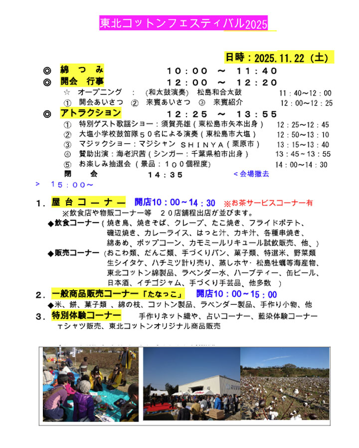 <日 時> 2025年11月22日(土)10:00~14:30※スケジュール ◎綿花栽培のボランティア(随時)募集中! 今年も、まもなく綿花栽培の作業が始まります。グループ、個人問わず、随時募集していますので、ぜひご協力をお願いいたします。 |